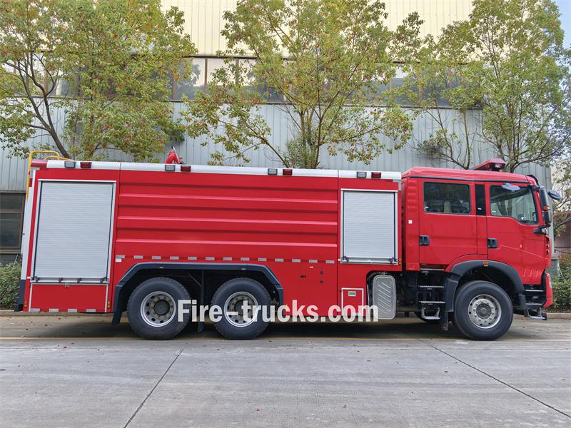 Howo TX460 6x4 12 cbm foam မီးသတ်ကားသည် 4600+1400mm wheelbase ပါရှိသော Sinotruk TX 6x4 cab ကို အသုံးပြုထားပြီး SINOTRUK MC11.46-61 အင်ဂျင်နှင့် HW19710 ဂီယာဘောက်စ် တပ်ဆင်ထားသည်။ အပေါ်ထပ်အဆောက်အအုံ၏ ရှေ့ဘက်တွင် မီးသတ်ပစ္စည်းအမျိုးမျိုးကို သိမ်းဆည်းရန်အတွက် ပစ္စည်းကရိယာအခန်းတစ်ခု ရှိပြီး အလယ်တွင် 9 cubic meter carbon steel ရေတိုင်ကီနှင့် 3 cubic meter foam တိုင်ကီတစ်ခု ပါရှိသည်။ နောက်ဘက်တွင် CB10/60-RS မီးသတ်စုပ်စက်၊ control panel နှင့် အရန်မီးသတ်ပစ္စည်းအချို့ တပ်ဆင်ထားသော ပန့်ခန်း ပါရှိသည်။ အမိုးပေါ်ရှိ ရေနှင့် foam တိုင်ကီများတွင် manhole များ တပ်ဆင်ထားပြီး PL8/48 မီးစောင့်ကြည့်ကိရိယာလည်း ပါဝင်သည်။