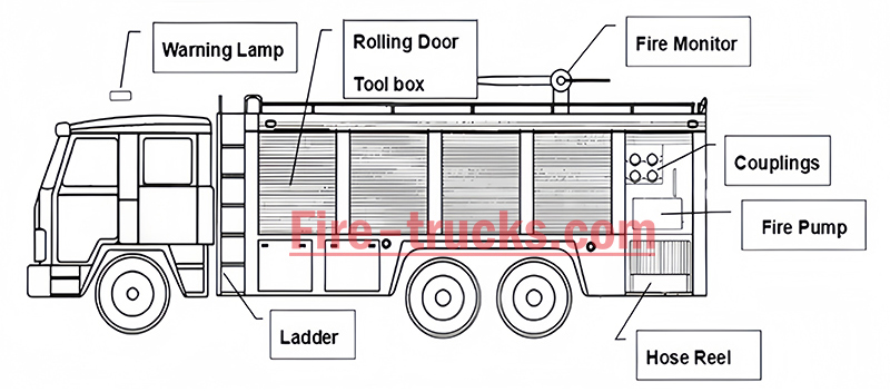 • စုပ်စက်ခန်း: မီးသတ်ပိုက်များ၊ ရေစုဆောင်းကိရိယာများ၊ စစ်ထုတ်ကိရိယာများ၊ မီးသတ်နှုတ်သီးများ၊ ရေမြှုပ်သေနတ်များ၊ စုပ်ပိုက်လိမ်များ၊ ရေလျှော့ချကိရိယာများ စသည်တို့ တပ်ဆင်ထားသည်။